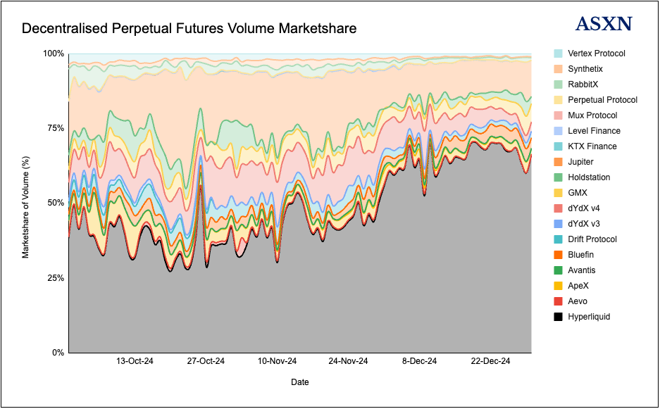 Unlike other decentralised perpetual exchanges post TGE, Hyperliquid has maintained and even expanded it’s volume market share.