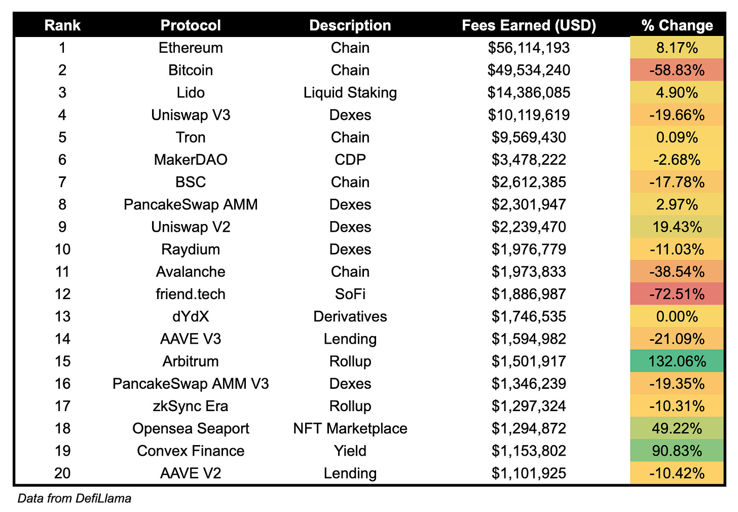 Arbitrum fees are up 132.06% this week. friend.tech fees earned are down 72.51%.