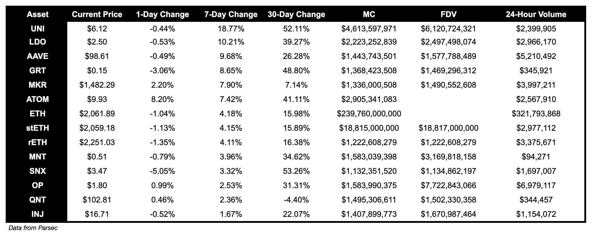 UNI had a good week, and is up 18.77%. Similarly LDO performed well, and is up 10.21%.