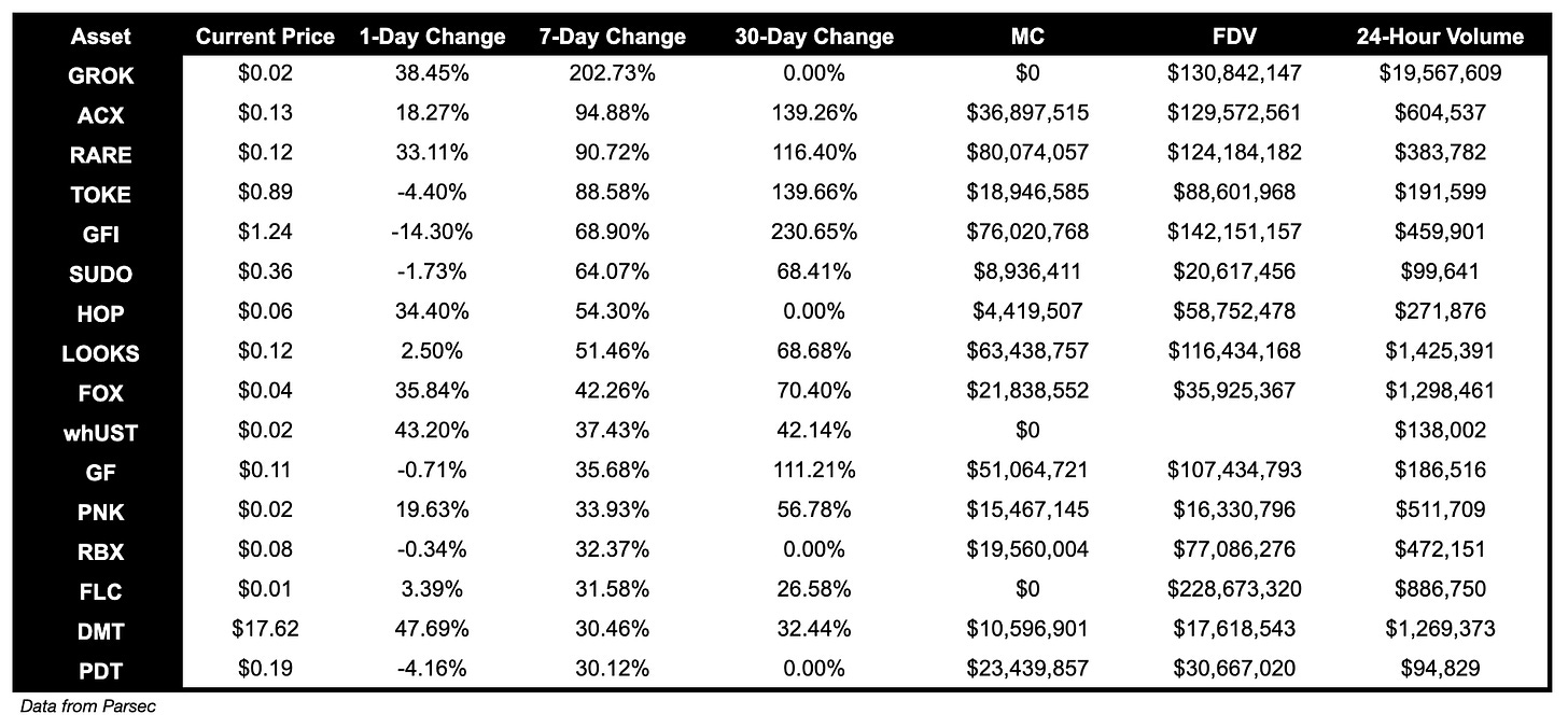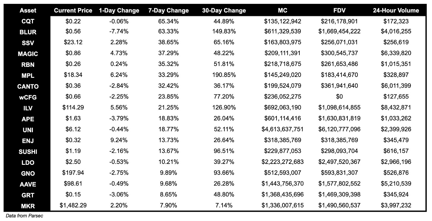 BLUR, up 63.33%, SSV, up 38.65%, were top performers for tokens above $100M MC over the past week.