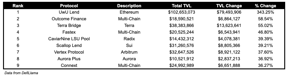 UwU Lend, lending on Ethereum, TVL grew by 343.25%.