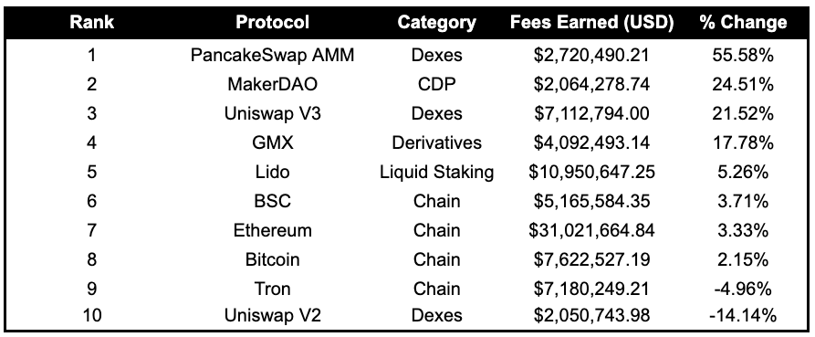 PancakeSwap’s fees earned has increased by 55.58% over the past day, reaching $2.7M.
