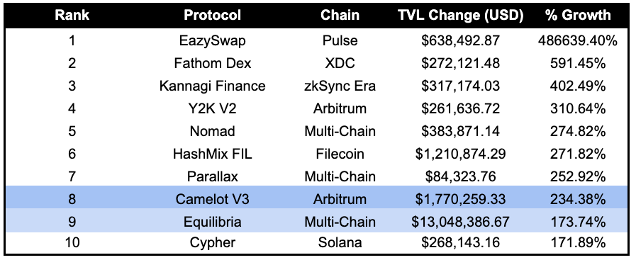 Most notable TVL gainers this week is Camelot v3 on Arbitrum and Equilibria.