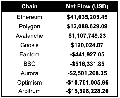 Most notable stablecoin flows from chains this week is the large net outflows from the largest two optimistic rollups, Arbitrum and Optimism. Polygon saw a $12mil net inflow of stables which could be related to the upcoming zk Validium chain and the upcoming token utility changes (farming for a new token?).