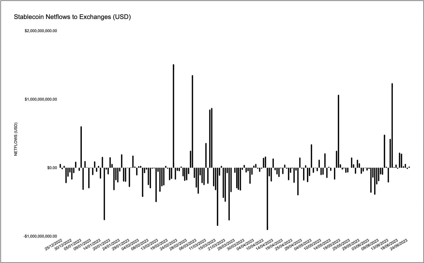 Moderate net inflows to exchanges in the past 7 days, with a net $517 mil stables moving to exchanges.