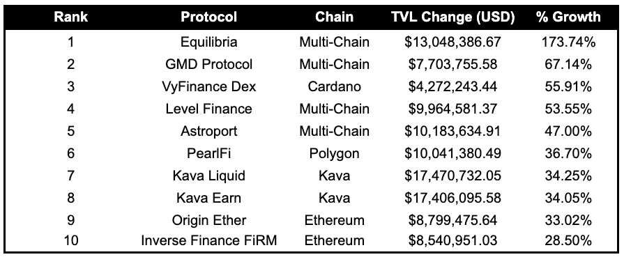 Equilibria, GMD Protocol and Level Finance are some relevant names who have seen large growth in TVL over the past 24 hours.